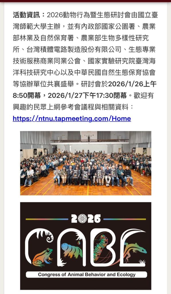 - 學術界年度盛會:2026 動物行為暨生態研討會